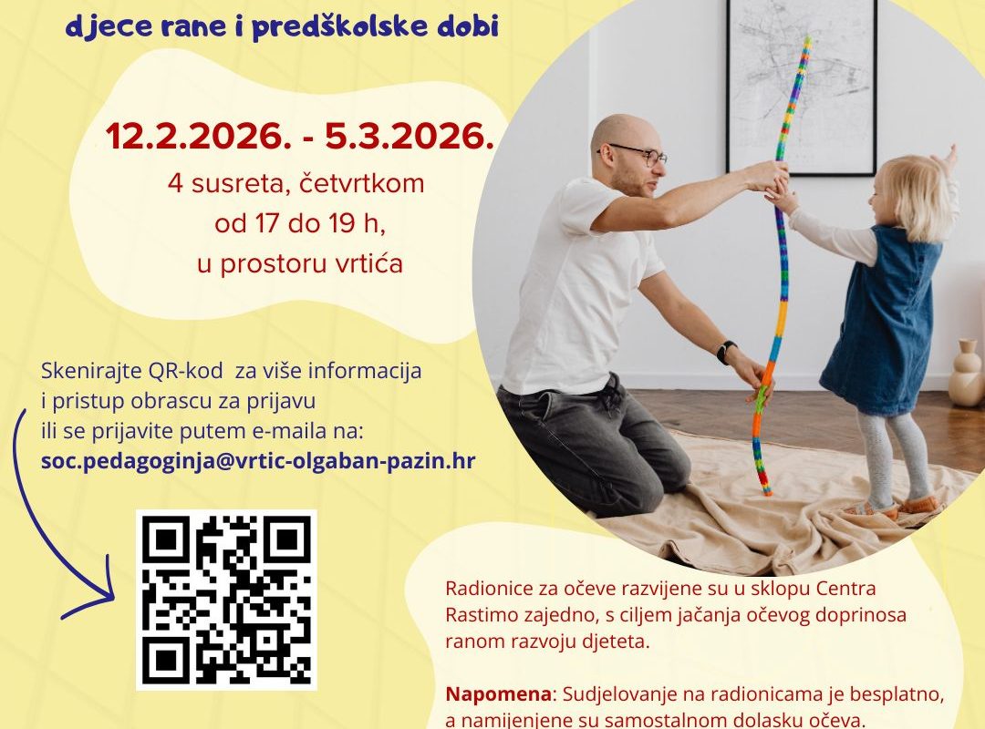 Dječji vrtić “Olga Ban” Pazin poziva zainteresirane očeve djece u dobi 1-5 godina na uključivanje u ciklus radionica za očeve. Ciklus se sastoji od 4 dvosatne radionice koje će se održavati četvrtkom od 17 do 19 sati, u prostoru vrtića. Voditeljice radionica su socijalna pedagoginja Jasmina…