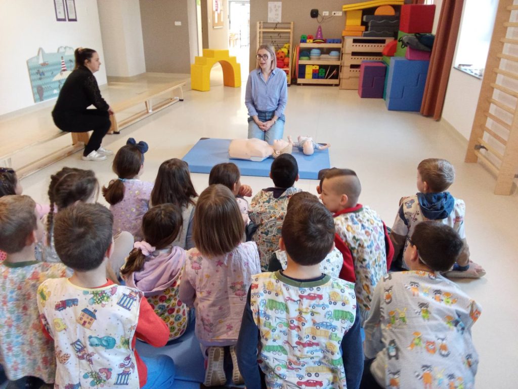 “Predškolarci” pazinskih i područnih vrtića na radionicama uče, na djeci prilagođen način, kako pomoći drugima u hitnim situacijama. Upoznaju se s osnovnim tehnikama poput masaže srca, postavljanja unesrećenog u bočni položaj, tretiranja rana i prijeloma, postupaka u slučaju gušenja i alergijskih reakcija, komunikacije s djelatnicima hitne medicinske službe…