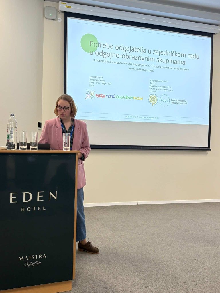 Odgojiteljica Lucija Jedrejčić iz Dječjeg vrtića “Olga Ban” Pazin održala je s doc. dr. sc. Danijelom Blanuša Trošelj izlaganje na temu potreba odgojitelja u zajedničkom radu u odgojno-obrazovnim skupinama.
