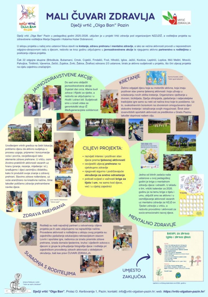 Naš je vrtić sudjelovao i kroz izradu stručnog plakata “Mali čuvari zdravlja”, koji je nastao kroz sudjelovanje odgojnih skupina u projektu Vrtić zdravlja.