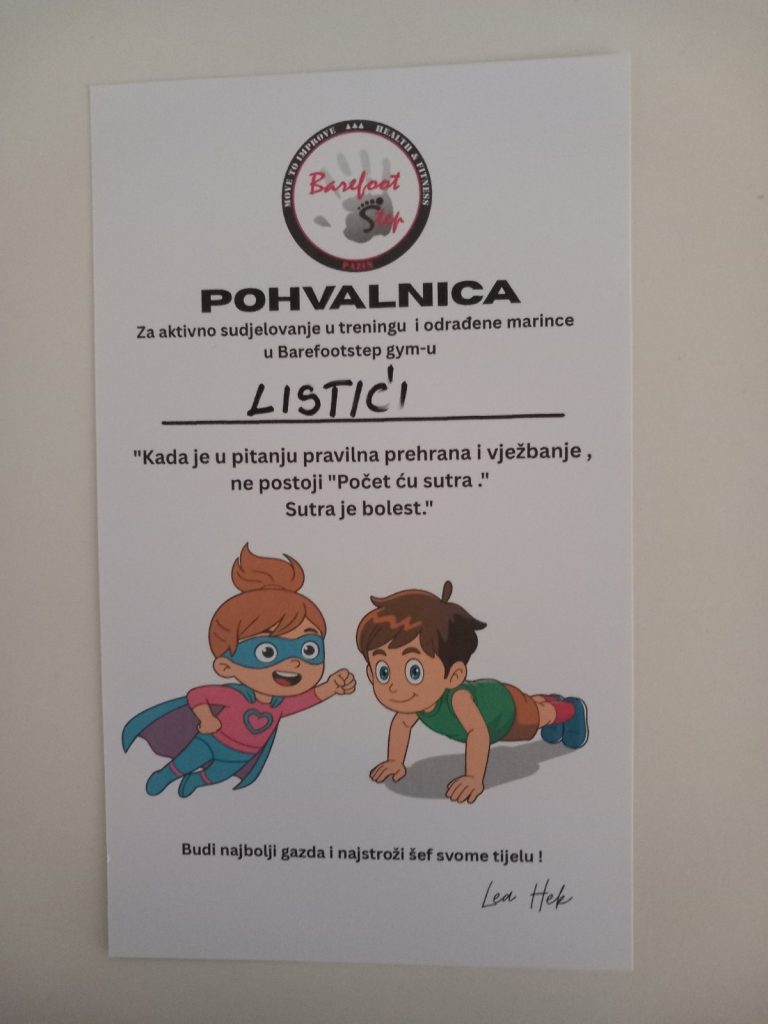 U petak, 10. travnja 2026., odgojno-obrazovna skupina Listići otputovala je vlakom u Heke. Posjetili su Barefootstep gym u kojem ih je dočekala fizioterapeutkinja te kondicijska i fitness trenerica, Lea Hek. Djecu je upoznala sa spravama, demonstrirala različite vježbe te je s njima odradila trening. Ovime se potiče djecu, ali i starije, da osvijeste kako je važno svakodnevno baviti se tjelesnim aktivnostima.