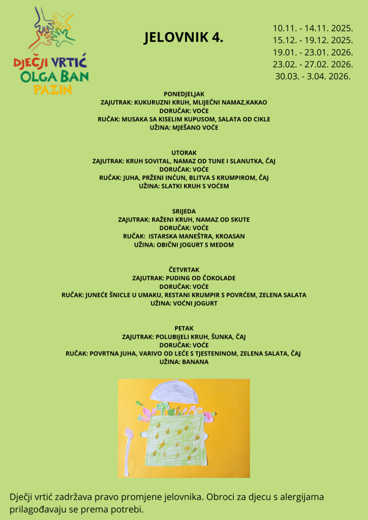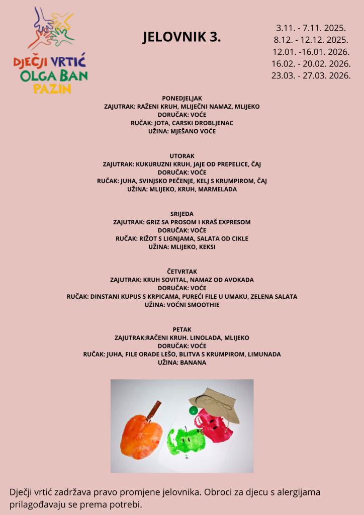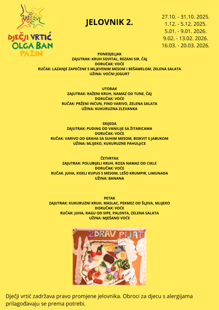 Tjedne jelovnike za sezonu jesen-zima 2025/26 možete preuzeti ovdje ili pregledati u nastavku.
